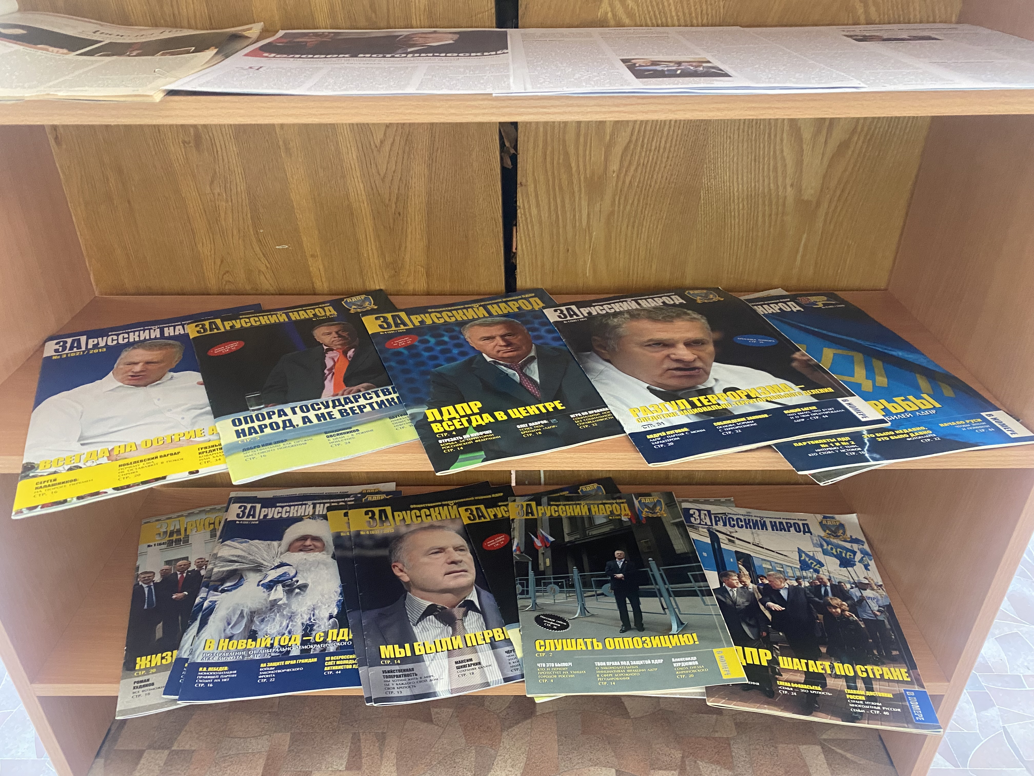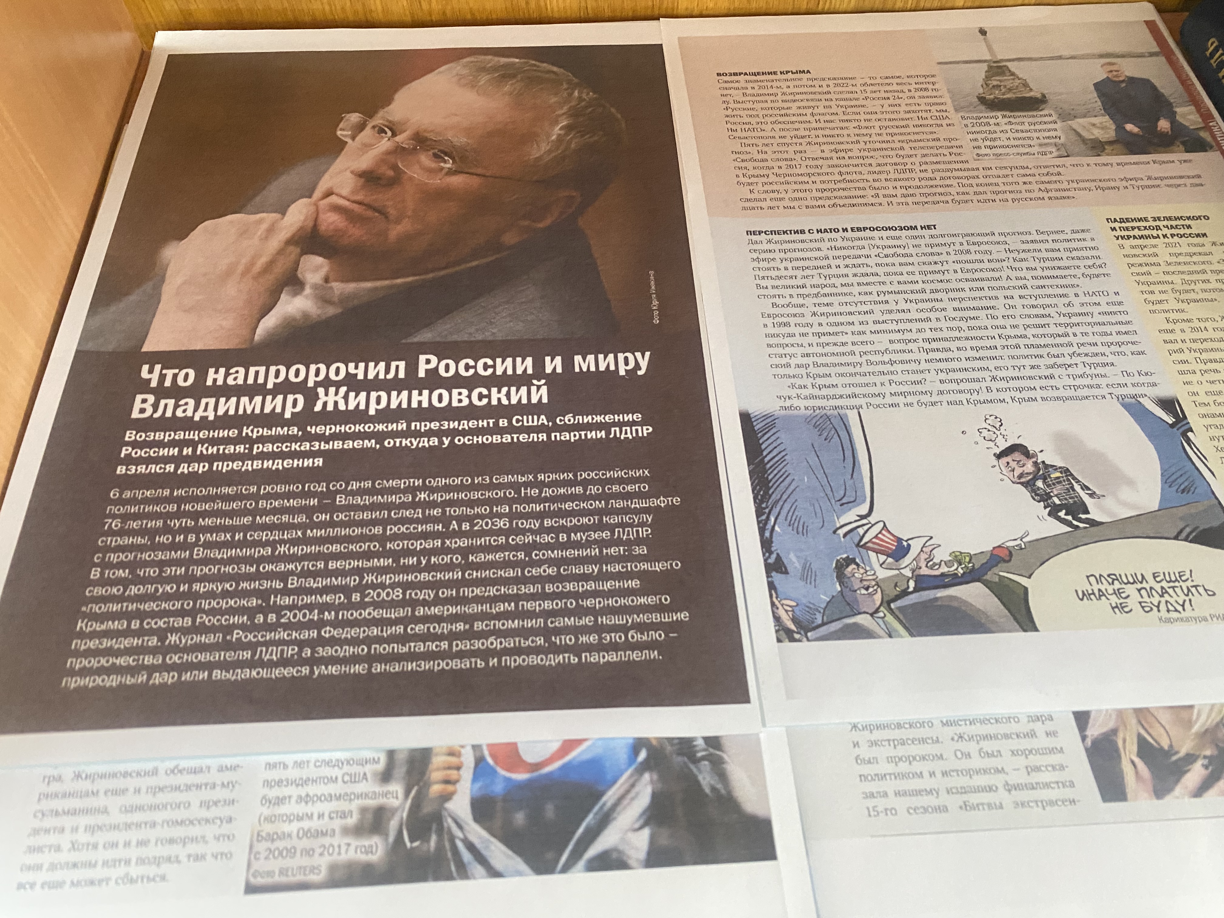 На выставке представлены материалы, позволяющие глубже познакомиться с Владимиром Жириновским: его собственные книги, издания, посвященные основанной им партии ЛДПР, открытки, журналы "За русский народ" и юбилейная книга "Жириновскому - 60". Современные статьи дополняют экспозицию, раскрывая темы его пророчеств, размышлений и взглядов на жизнь.